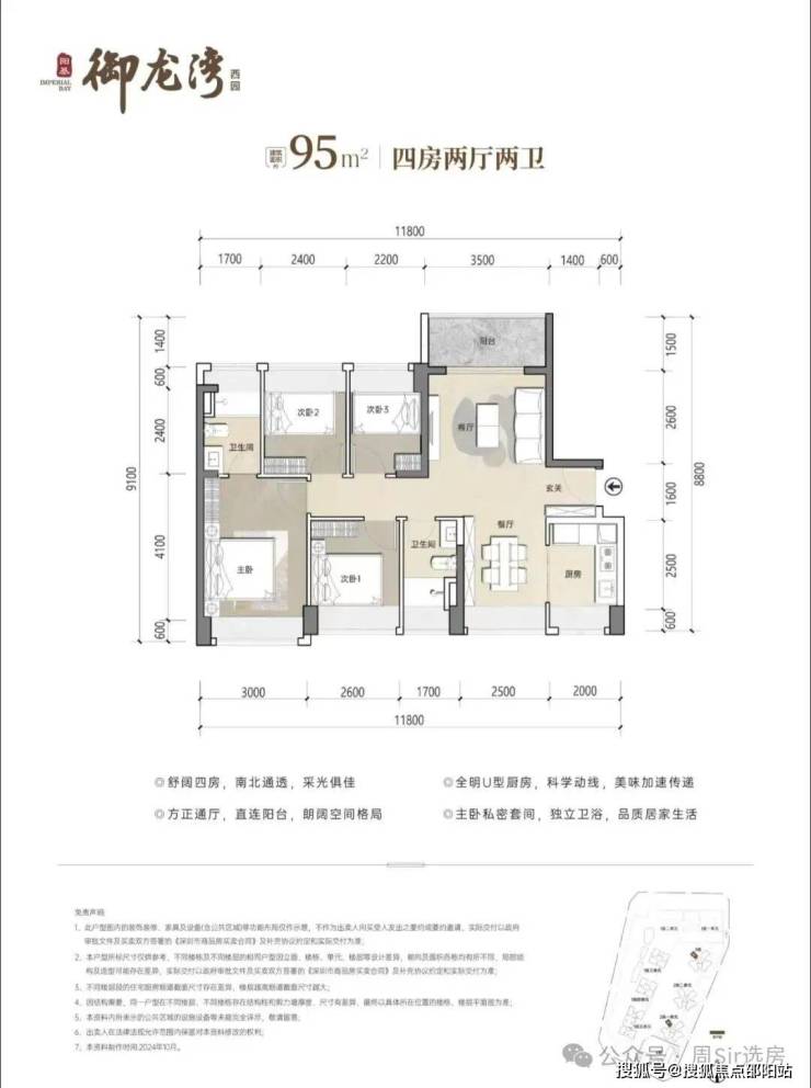 95㎡4房2卫,分布在2栋1单元06户型,设计的是竖厅南北通透格局,客厅开间3.5米,五开间朝南,U型厨房,公卫三段式分离设计,得房率约79.25%(不含赠送),阳台主朝东北向,加上赠送得房率约93%。