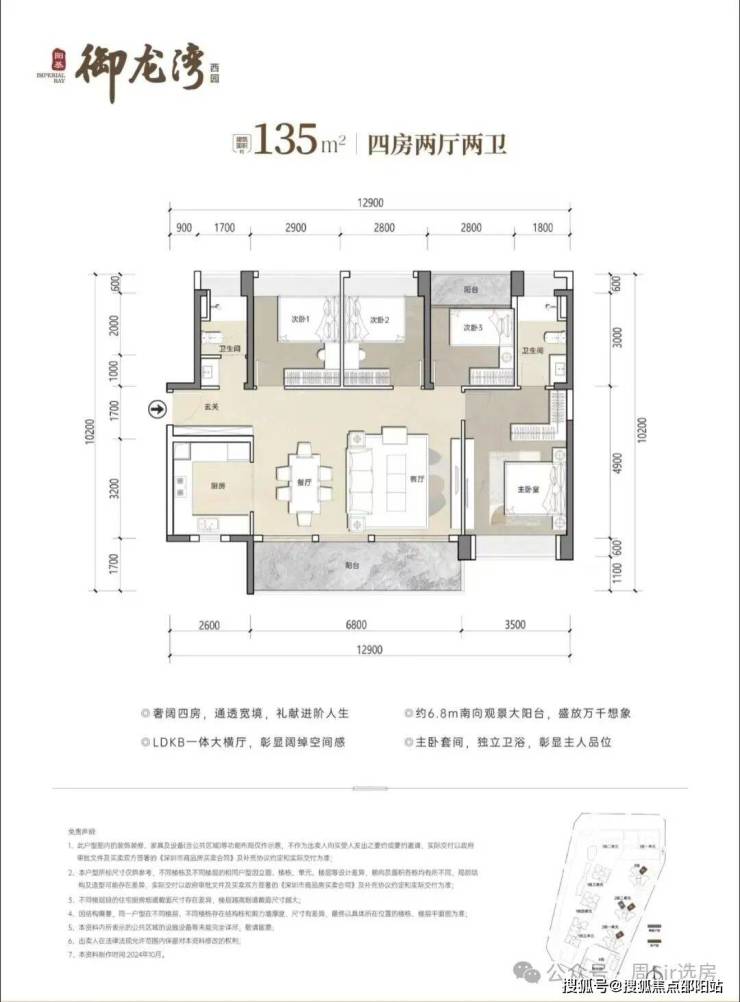 135㎡4房2卫,设计的是横厅南北通透格局,客餐厅开间6.8米,LDKB一体化设计,四开间朝南,U型厨房,公卫三段式分离设计,得房率约79.25%(不含赠送),阳台主朝东南或西南向,加上赠送得房率约90%