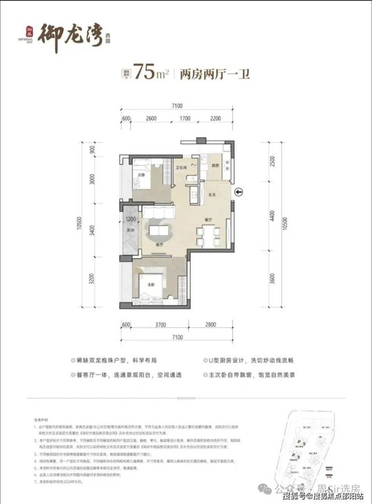 75㎡2房1卫,分布在1栋3/4单元03/06户型,设计的是竖厅稀缺的双龙抱珠格局,客厅开间3.4米,U型厨房,卫生间三段式分离设计,得房率约73.26%(不含赠送),东南或西北朝向,加上赠送得房率约80%。
