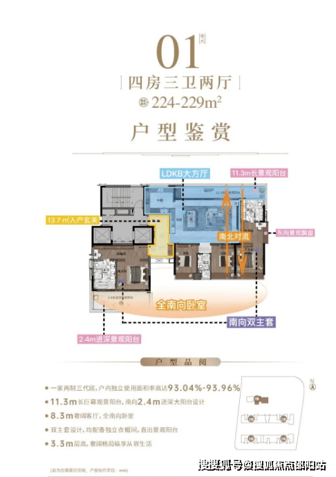 面积段: 提供从130平方米至224-229平方米不等的多种户型,主要为三房至四房设计。小高层采用2梯2户板式设计,层高达3.3米,确保了空间的开阔感和舒适度。