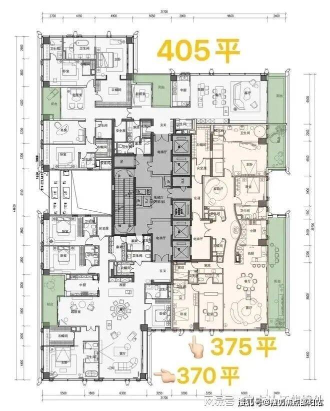 高区(41F起,150-200米):6000万+,深圳湾“精髓所在”。配置:5梯3户,专梯入户,150米以上东向看海“永无遮挡”,视野直接拉满。王牌户型:375㎡4+1 房五卫(四套间+家庭厅+家政套间)—— 这是我们团队一致认为的“最优解”。全明格局,每个套间都带独立卫浴,家庭厅可分隔出“亲子互动区”,家政套间独立于生活区域,隐私性拉满。150米高空看海,能俯瞰整个深圳湾人才公园+福田罗湖天际线,景观冲击力堪比深圳湾壹号顶复,总价预计6000-7500万。