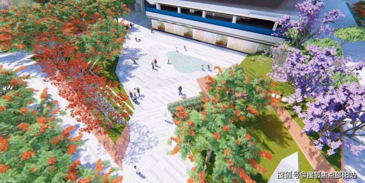 方案将原设计的大量硬质铺地更改为乔木花园,为往来行人增添骄阳下的庇护。 选用了数百颗观花乔木——广州樱、凤凰木、大腹木棉、紫花风铃木、蓝花楹——春夏秋冬,红粉蓝绿……