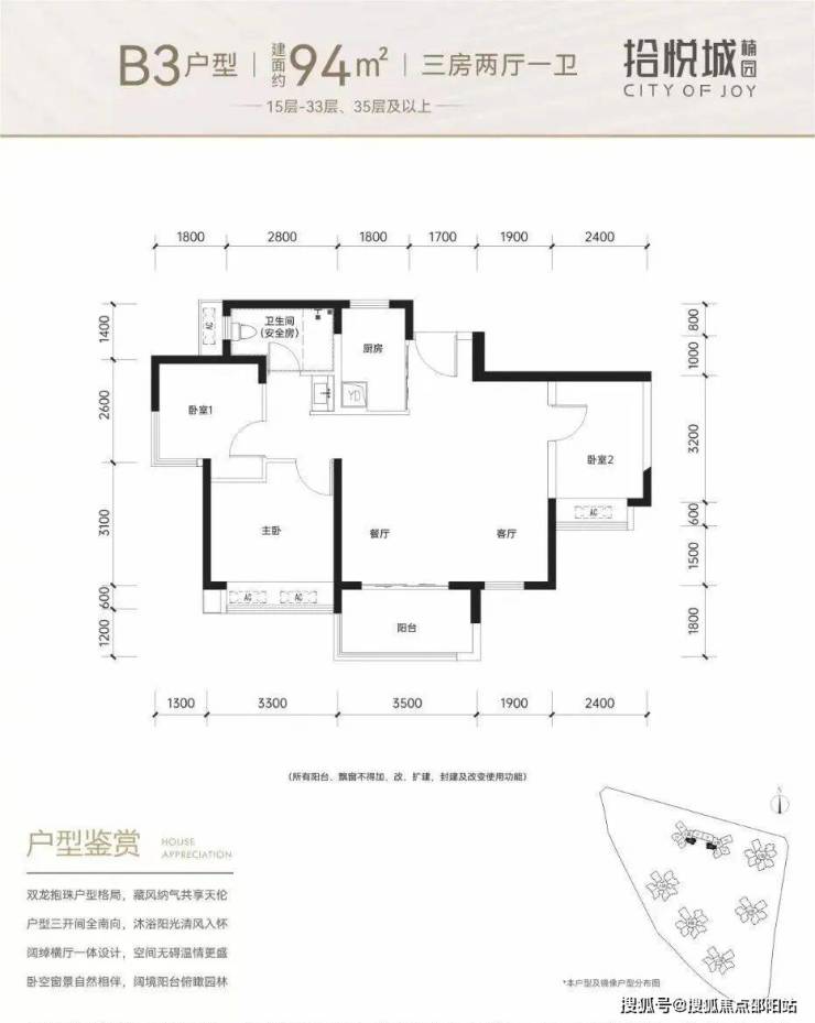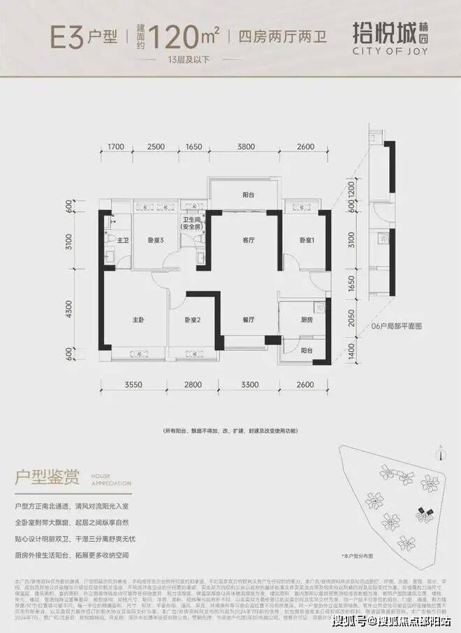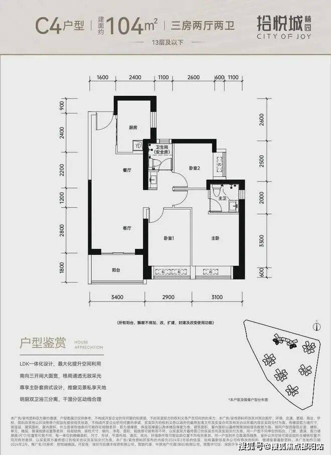 100平三房:设计的是竖厅格局,进门入户玄关,客厅3.4米开间,LDKB一体化设计,3个卧室分别做到了3米/2.9米/2.5米的宽度,U型厨房,公卫三段式分离,得房率:77.14%(不含赠送),阳台1.8米宽度,西南或东南朝向。