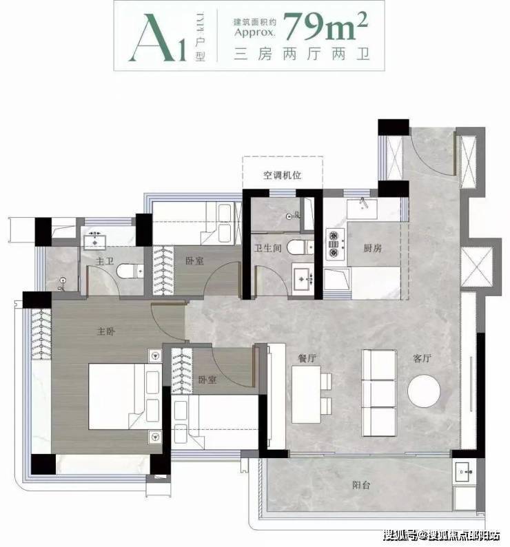 79方的A2户型,3房2卫,一样有5.3米面宽阔景阳台,以及270°大飘窗主卧。这个是飞机户型。
