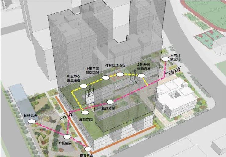 在社区入口处:利用商业和交通之间的关系,通过链接沿街商业,实现商业式归家。