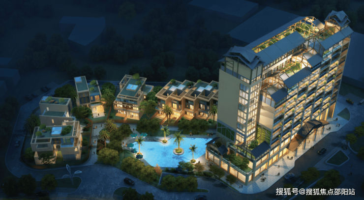✰退台设计+坡屋顶:融合米黄色实墙风格,打造热带天际线;40%高绿化率,泳池、步道、庭院交织成“城市绿洲”。