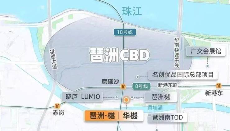 项目位于琶洲西区核心,紧邻8/18号线交汇的磨碟沙地铁站(直线约200米),步行可达珠江支流黄埔涌,南向直面一线江景,北望琶洲电商总部CBD天际线。