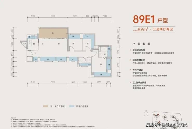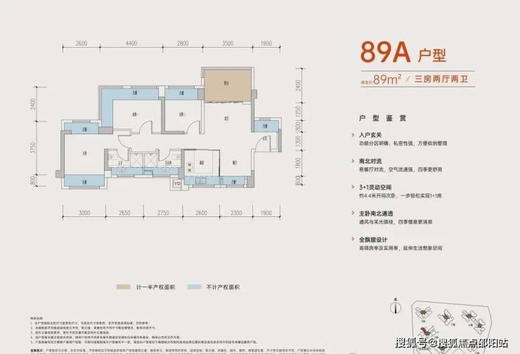 89㎡的3+1房2厅2卫,A户型,设计的是竖厅南北通透格局,进门入户玄关,客厅3.5米开间,,五开间朝南,主卧南北通透双飘窗,3个卧室分别做到了主卧15.73㎡/次卧14.08㎡/次卧8.96㎡(包含墙体飘窗),得房率约:77.39%(不含赠送),阳台主朝东北向,这次推出最靓的户型可以改4房,赠送面积24.5㎡,加上赠送得房率高达104.87%。