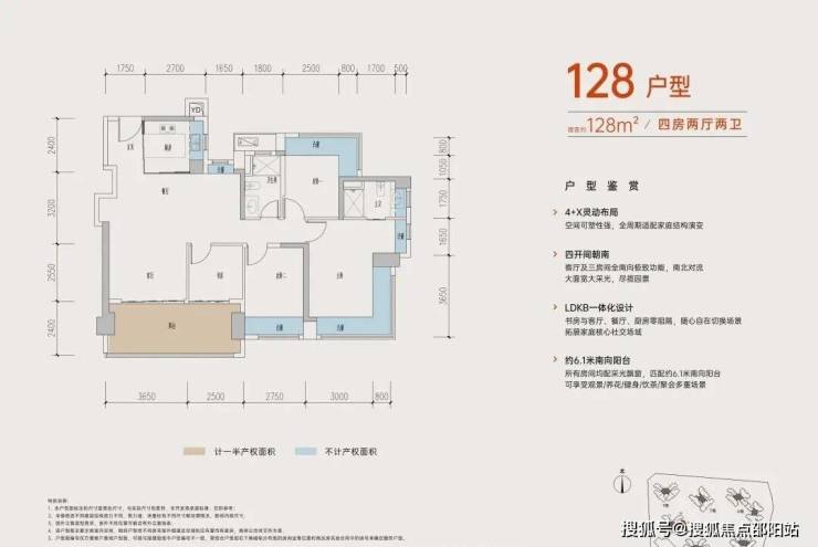 128㎡的4房2厅2卫,设计的是经典竖厅格局,进门入户玄关,客厅3.65米开间,四开间朝南,动静分区,主卧+1个次卧270度大飘窗,客厅连接次卧出6.15米长大阳台,4个卧室分别做到了主卧20.14㎡/次卧11.28㎡/次卧10.58㎡/次卧6.37㎡(包含墙体飘窗),得房率约:77.39%(不含赠送),东南朝向。赠送面积21.54㎡,加上赠送得房率94.45%。