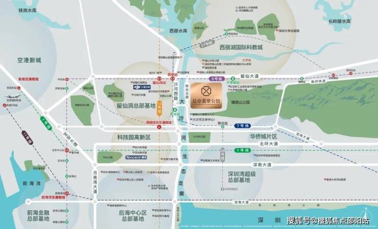 ②西丽湖国际科教城——创新驱动,构建“一心、两轴、三区、六大创新组团”的功能布局结构。汇聚深圳大学、南方科技大学、华南理工深圳研究生院、华南师大深圳研究生院、哈工大深圳研究生院等7所高校,超1100家的国家高新技术企业。