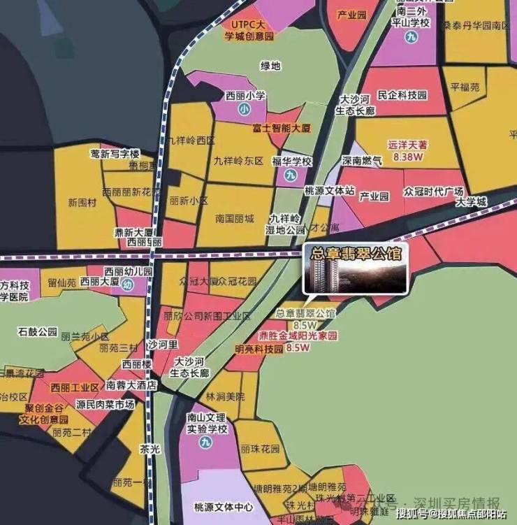 总章翡翠公馆踞南山西丽留仙大道与珠光北路交汇处南侧,占地约 1.28 万㎡,总建面约 8.18 万㎡,由 5 栋 31-32 层住宅塔楼及商业配套组成,建筑呈 “一” 字布局。项目东接塘朗山山麓,西临珠光北路,隔路对望大沙河生态走廊,生态环境优越;北侧为待建住宅用地及大学城创客小镇。