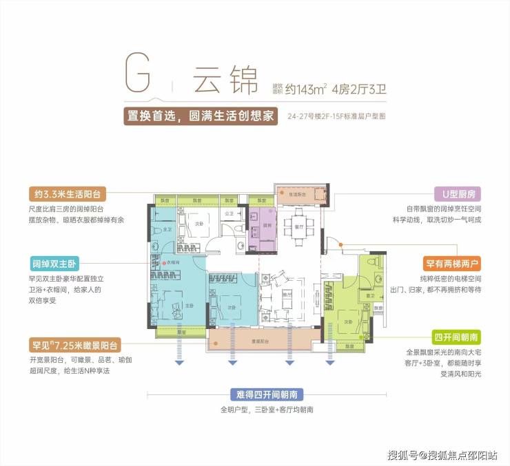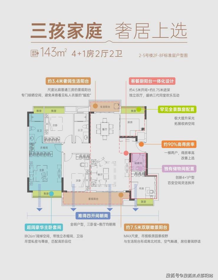 二期央景大宅:143㎡四房两厅三卫,是双主卧套间,电梯能直接到家门口,房子南北通透,还能送约 22㎡面积。