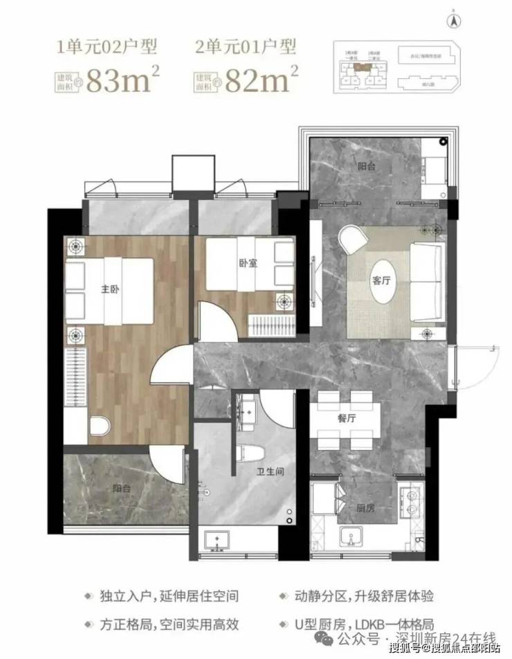 82-83㎡的3房2厅1卫,1栋1单元02户型/1栋2单元01户型,设计的是竖厅南北通透格局,独立入户,客厅3.2米开间,LDKB一体化设计,动静分区,南北双阳台,U型厨房,卫生间干湿分离,阳台正北朝向。