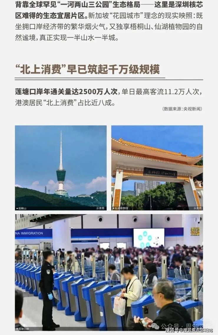 这一独特地理位置赋予项目两大核心优势:一是生态资源丰富,背靠梧桐山麓,周边环绕仙湖植物园等67个公园,3km范围内负氧离子浓度全市前列,为居民提供天然氧吧般的居住环境;二是跨境便利性突出,通过莲塘口岸可快速通达香港,口岸开通后客流量持续攀升,2024年出入境人员突破2000万人次,是深港"东进东出"战略的重要枢纽。项目所在区域被官方定位为"深港深度融合发展的试验区、先行区",未来随着深港合作深化,这一区位价值将进一步凸显。