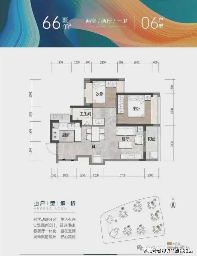 建面约66㎡ 2房2厅1卫:南北通透,全凸窗设计,开放式U型厨房。