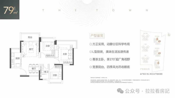 • 79㎡三房两厅一卫:竖厅南北通透格局,客厅3.6米开间,LDKB一体化设计,动静分区,四开间朝南,主卧270°超广角视野,卫生间干湿分离,得房率为76.33%(不含赠送),东南朝向。