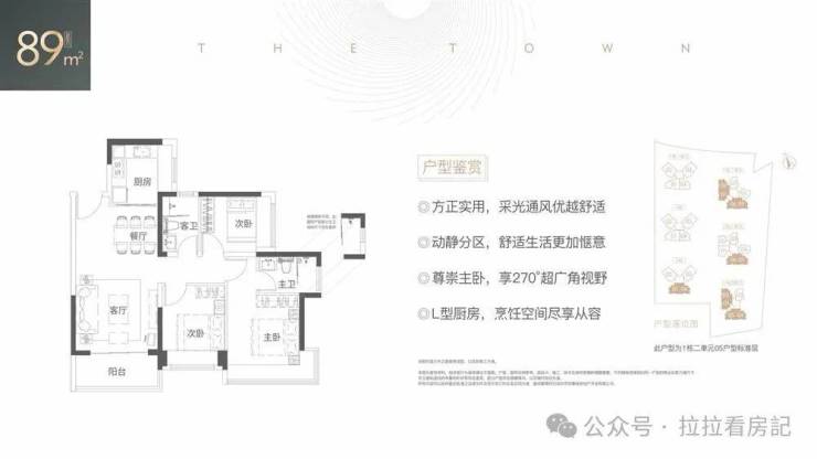 • 89㎡三房两厅两卫:经典竖厅格局,客厅3.6米开间,LDKB一体化设计,动静分区,3个卧室分别做到了3.2米、2.7米、2.5米的宽度,主卧270°超广角视野,L型厨房,卫生间干湿分离,得房率为76.33%(不含赠送),有西北或西南朝向。