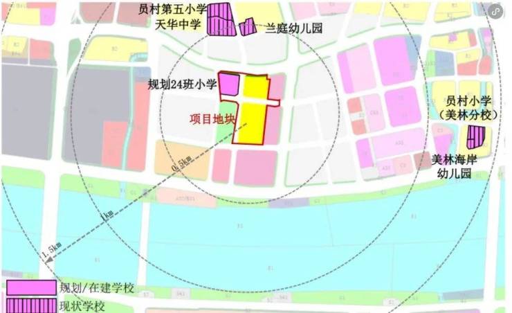 地块1.5公里范围内有员村第五小学、天华中学、兰庭幼儿园、员村小学(美林分校)、美林海岸幼儿园等。