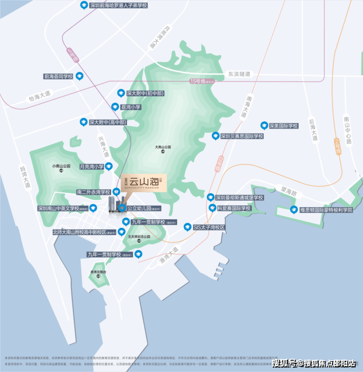 🔘周边教育信息介绍:社区自带双18班幼儿园(建设中)、直线距离约280米公办九年一贯制南二外赤湾学校、深大附中高中部、北师大南山附校高中新校区(即市第三十高级中学,建设中)、两所九年一贯制学校(规划中)