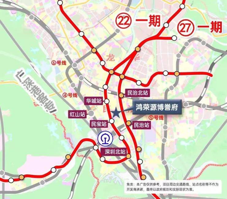 地铁:4、6号线,红山站约1.3公里。1站直达深圳北站。4站到福田。5号线,民治站约1.4公里。22号线(规划中)四轨交汇环绕。