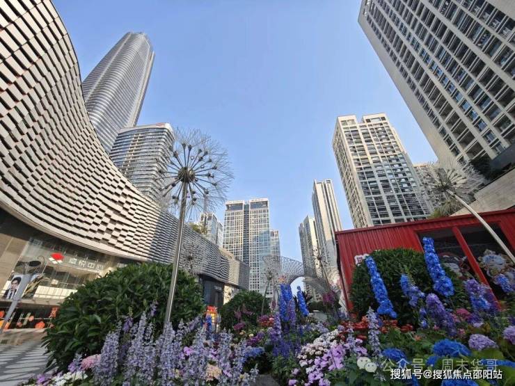 现代化建筑在花的映衬下,这个角度美。