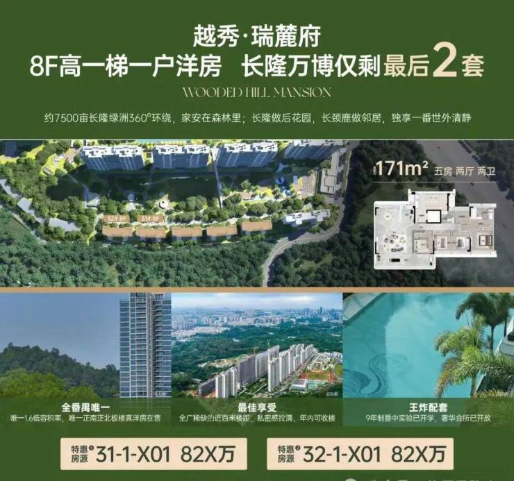 越秀瑞麓府位于长隆 - 万博板块,居住舒适度非常高,全部都是板楼设计,小区容积率仅1.6,且项目还有九年制番中实验学校,小区内部还拥有11万方中心园林,综合各个特点都非常适合一些改善客户