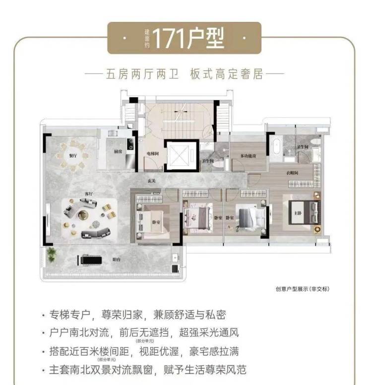 中轴园林上,环幕景观楼王·限量级CBD低密板式高层·专梯专户 | 私属电梯门厅,尽显私密尊崇·四开间朝南,南北对流阳光满格·双阳台设计,近9米宽巨幕阳台·双主卧套房,让孩子多一度独立空间·总统级主卧奢套,步入式衣帽间、浴缸