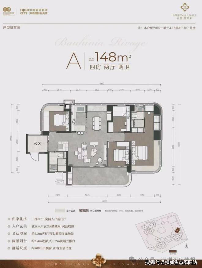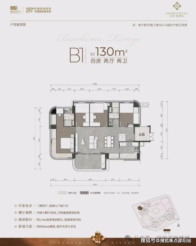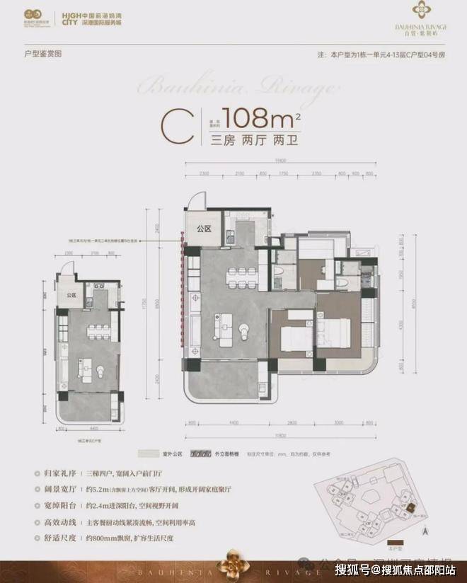 项目占地约 1.5 万㎡,建面约 6.67 万㎡,由 3 栋 36-41 层高层组成,共410 套纯商品房(无保障房)。主推108-148㎡3-4 房,3.1 米层高、3 梯 4 户,得房率91%-95%,户户东南 / 西南朝向,配 270° 飘窗与独立电梯厅。社区配四层复合园林、泳池与泛会所,车位比约1:1.41。距地铁 5 号线妈湾站约 500 米,近南二外创新妈湾学校,精装交付(6000 元 /㎡标准),招商积余物业服务。备案均价约10.78 万 /㎡,2027 年 3 月交付,是前海高性价比纯改善标杆。