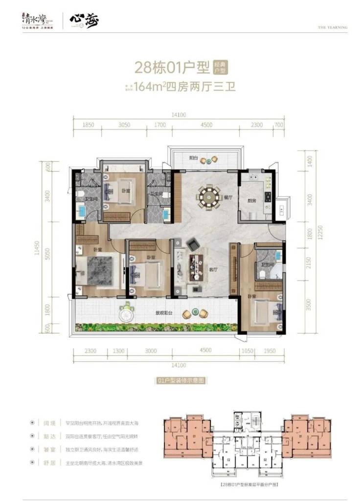 15#05号房、16#01号房、29#01号房141㎡户型,四房两厅两卫15#01号位、16#05号位、28#01、05号、164㎡四房三卫
