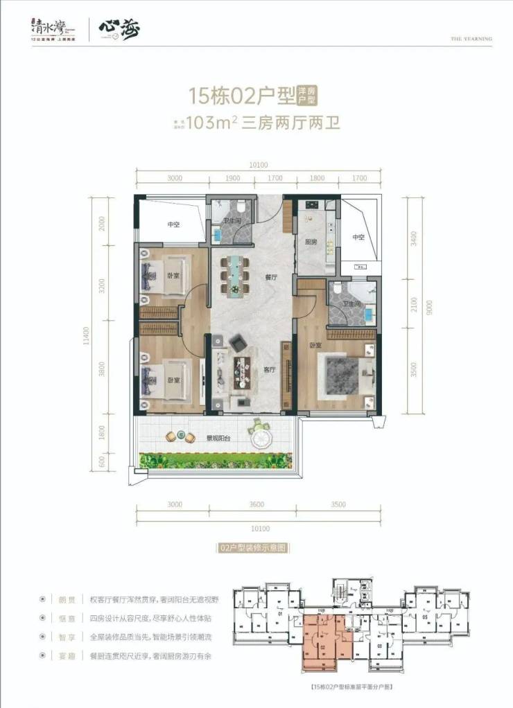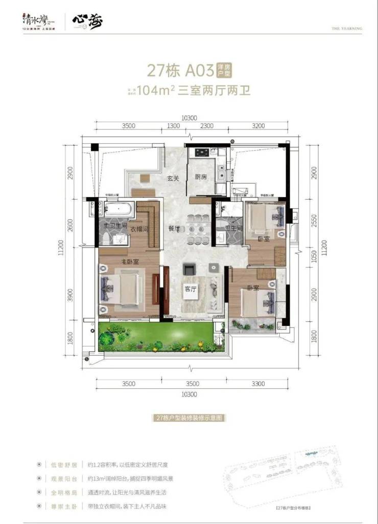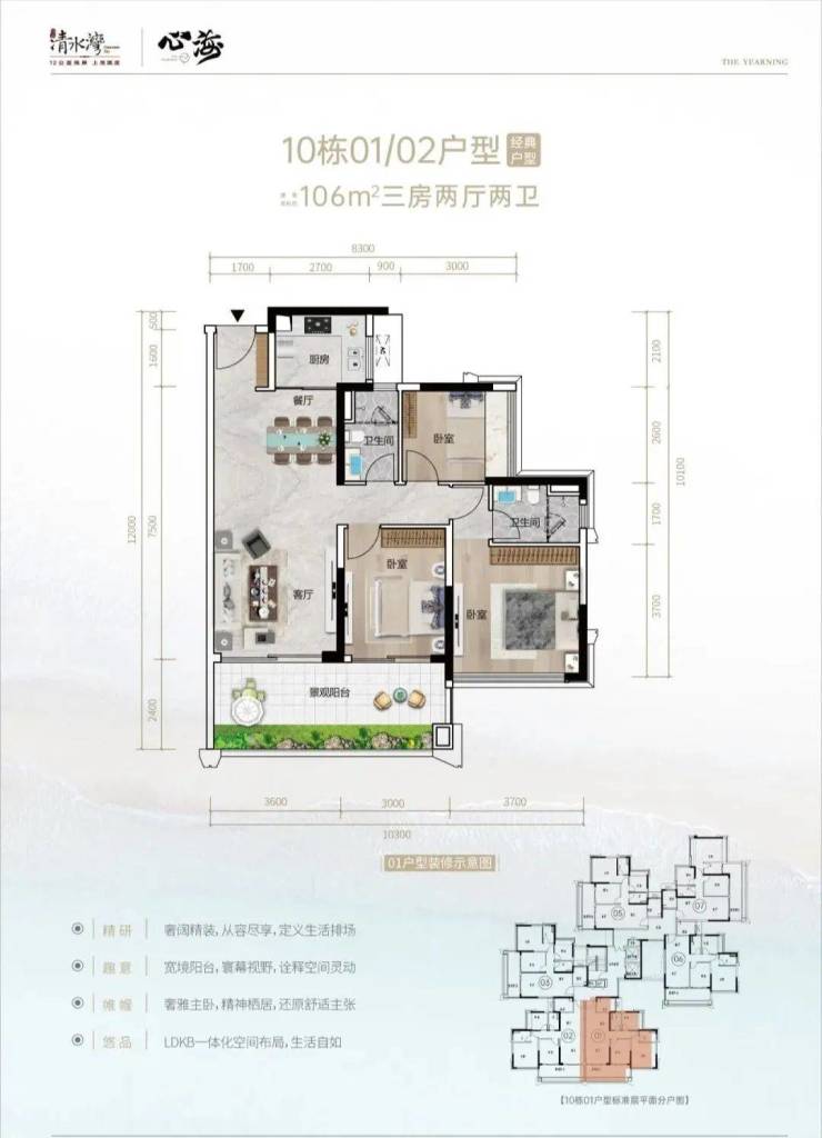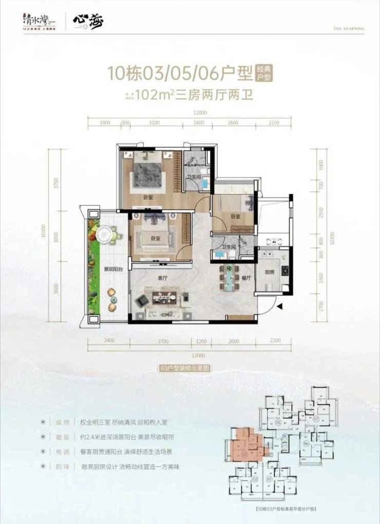 【地块编号】:B01-3(西)地块【用地面积】:约4.53万㎡【建筑面积】:约5.44万㎡【组团总容积率】:1.2【组团总绿化率】:>40%【物业费】:洋房3.8元/㎡/月【产权年限】:70年【楼栋数】:4栋(小高层)【总户数】:445套(小高层)【交付标准】:拎包入住(家具、家电、纱窗、窗帘及床品四件套)【面积段】:目前在推小高层产品面积约:102、104、126、142、165㎡【推荐理由】:地块位于清水湾大道中段,地段优越性显而易见,资源配套优渥,享受整个清水湾的资源。800米近海距离,步行十分钟可达海滩。该地块规划别墅洋房,不仅拥有最佳的视野和采光效果,也获得更低密度舒适的生活,接近于叠墅和洋房的居住实感。12层总高,奢阔楼间距,舒适度高,多面积户型可选,周边配套丰富,生活便捷,湾区置业的不二之选。