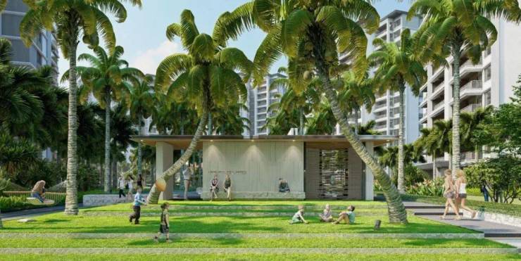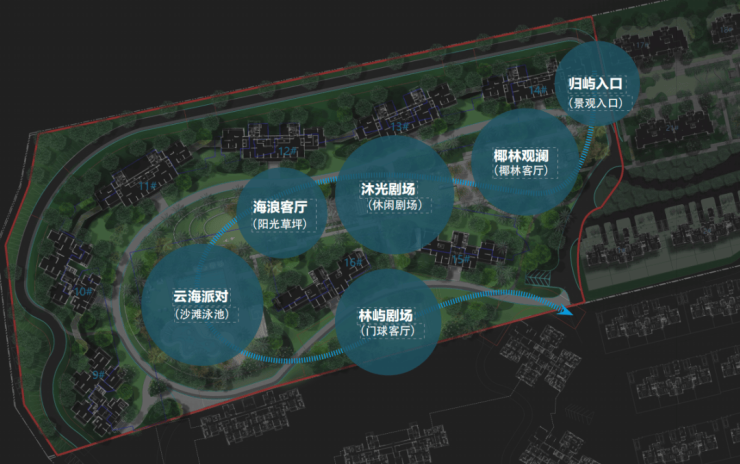 以“林屿” 为主线贯穿园林始终,结合度假生活的需求和海岛的居住文化、自然资源景观等,园林八大主题空间串联,包括椰林嘉观澜,沐光剧场、海浪客厅等场景交织,兼顾功能性和美观性,为湾区园林生活树立一个新标准。