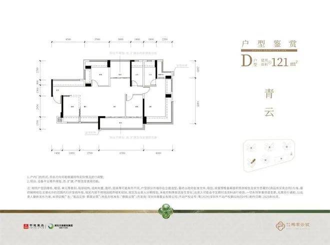 建面约121㎡的3房为横厅通透布局设计,阳台开间约6.3米,主卧、次卧带L型飘窗,玄关、厨房、卫生间带全景飘窗,户型采光、通透性较好。