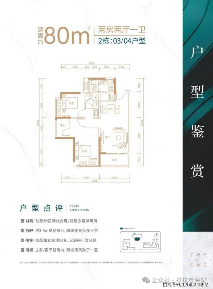 80㎡3房2厅1卫:客厅朝南带阳台,主卧朝南,次卧朝西。该户型分布在2栋03、04号房,空间布局合理,适合三口之家居住。