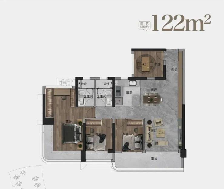 122㎡户型的4房,布局与105㎡户型相似,主要是加大了几个功能区的尺寸。阳台比105㎡的户型还长0.5米,约6.6米,主次卧空间也更大,更实用。