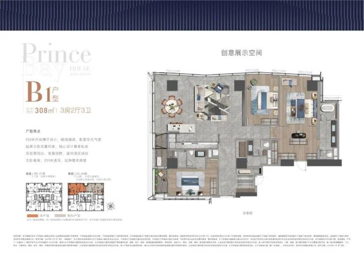 大尺度空间 纵享环幕视野大平面大尺度定位,层高约3.6米,横厅设计确保最大化观景面全户型纵享环幕视野。项目打造主力建面约215-415㎡纯粹品质公寓共191席,顶层为建面约1270㎡公寓产品。
