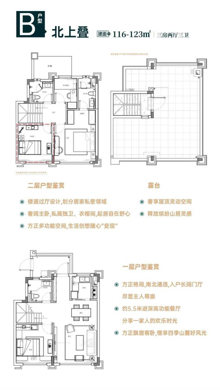 北上叠:建筑面积约116-123㎡三房两厅三卫