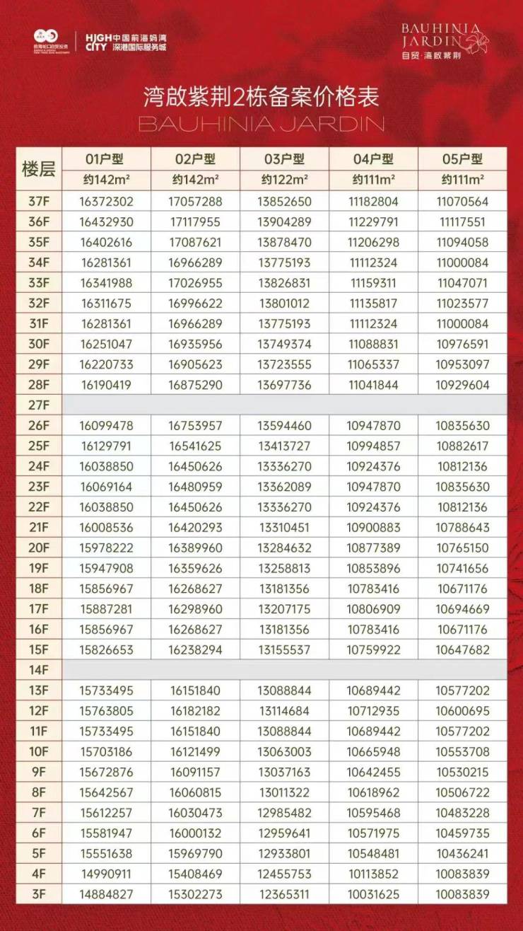 前海妈湾【自贸湾啟紫荆府】于2025年6月13日取证入市,本次加推2栋,也是该楼盘的收官之作,共165套房源,面积有111㎡的3房2厅2卫,122-142㎡的4房2厅2卫户型。