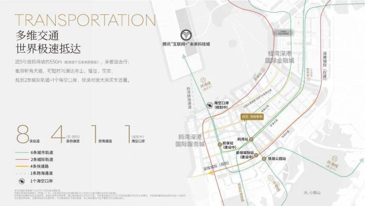 自贸湾啟紫荆府周边交通立体便捷。距离5号线妈湾站约550米,步行即可到达,通过地铁可快速通达南山、福田、宝安等地。周边共规划6条地铁线、2条城际轨道,为业主的出行提供更多选择。
