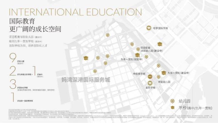 湾啟紫荆府自带1所18班幼儿园,东南侧规划有1所九年制36班公办学校(待建),目前还没公布,大概率也是南二外集团校区,会跟紫荆府同步交付;另外在东南侧距离700米处有一所南山第二外国语学校创新学校妈湾校区,未来将为业主提供更多教育选择。
