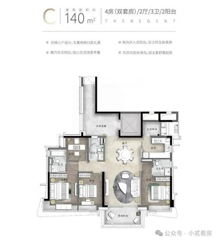 【户型面积】140㎡-270㎡四房双主套;360㎡-480㎡(5房 2 厅双主套+1工人房)三梯两户