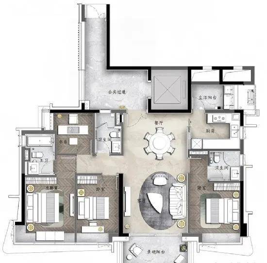【B户型】约200㎡一线临江环幕大宅,一线望江 270°环幕三江视野,独立电梯入户,多功能入户花园,简约半开放式厨房,美味品味兼得,阔绰双主套房设计,尊享舒奢起居,R9栋为开放式3+1房交付,客厅与书房打通,开间可拓展至7.2米