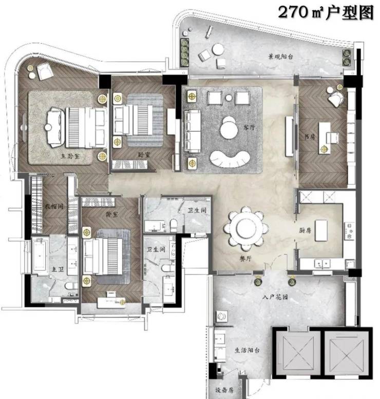 【A户型】王牌户型 270㎡环幕江景四房,约9米超大邮轮式阳台,一线望江无遮挡,专梯专户,墅级空中双花园,约28㎡超大私家庭院,多功能空间,约42㎡超大主卧空间,270°环幕江景,阔绰双主套房设计
