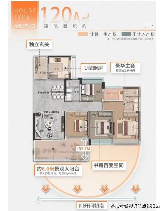 该户型使用面积跟120㎡的二手房差不多。书房改造后进深达到6米,这个场景非常适合双胞胎宝宝居住。同样地,景观大阳台霸气延展到约6.5米,最小进深达也有2.4米。