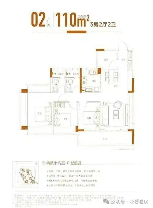 110㎡三房:西南朝向,双阳台配置,客厅与主卧尺度优于二期,适合二孩家庭。