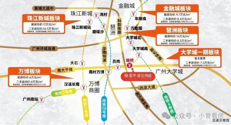 交通地铁:星河盛世锦城位于万博 CBD 北侧,直线距离 7 号线板桥站约 700 米(三期组团稍远),实测步行 10 分钟内可达。地铁 2 站到万博、5 站到琶洲,换乘 18 号线可快速通达珠江新城,适合在天河、海珠上班的通勤族。自驾方面,出门即上南大干线,无缝连接广州南站、金融城等核心区,实测 30 分钟可到珠江新城,交通便利性是最大卖点之一。
