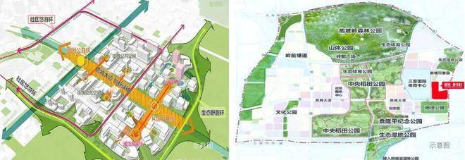 【一园】中央稻田公园为核心开放空间及中央轴心,政务组团、文化中心、体育中心等环绕
