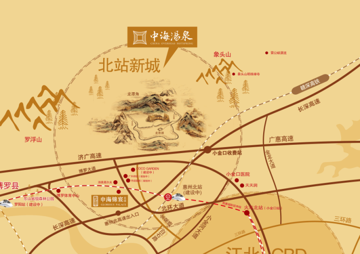 五山环抱。项目背靠罗浮山、象头山、环拥龙潭角、茶山、龟山五山,群山环抱的自然环境与生俱来,居住在汤泉,即是居住在天然大氧吧之中。