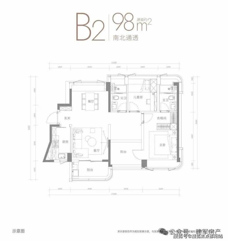 97㎡的3房2厅2卫,设计的竖厅格局,客厅3.5米开间,客餐厅一体化,三开间朝南,3个卧室分别是3.2米/3米/2.6米的宽度,U型厨房,得房率:76.55%(不含赠送),朝南向看花园。
