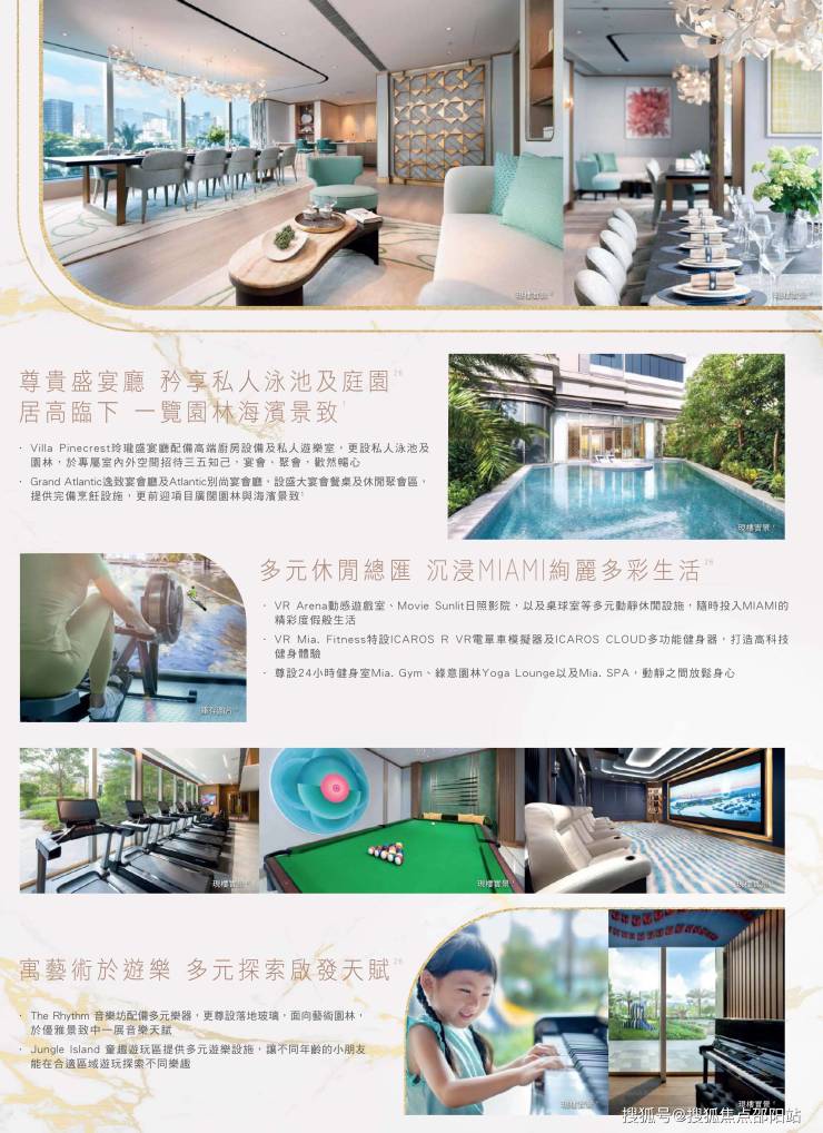配套设施方面:住客会所「CLUB MIAMI」,由国际著名室内设计团队G.A Group设计,注入丰富迈阿密色彩和奢华元素,提供包括户外临海泳池、室内恒温泳池及按摩池、全港屋苑罕有的Float Fit HIIT(水上高强度间歇训练)、健身室、The Grove丛林吧、Jungle Island童趣游玩区、三大尊贵宴会厅、Mia. SPA、VR Arena动感游戏室、Movie Sunlit日照影院等数十项设施