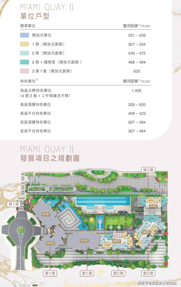 户型:值得一提的是,第8座为整个 MIAMI QUAY项目的唯一低座住宅,楼高7层,仅设25伙,位处项目最前排、最临海的位置。 而项目2期的单位实用面积介乎251至1,426平方呎,间隔涵盖开放式至四房,楼层高度由2.7至4.15米,普遍采用开放式厨房设计,仅有一伙设独立式厨房(梗厨),多数配置露台及工作平台。